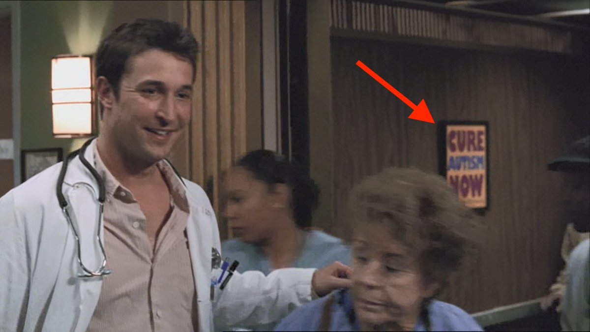 Long before that, around season eight, these posters start appearing around the ER. There’s one near the admit desk, one in the doctor’s lounge, another in the lift. They say, in big cartoon letters, Cure Autism Now. Nobody ever refers to them but once you notice them, they seem to be everywhere and those big letters feel more like propaganda than set dressing. Every time I spot one, I get annoyed. Season eight of ER was first broadcast in the US in late 2001 and early 2002, so these posters are 20 years old and yet still making me angry.